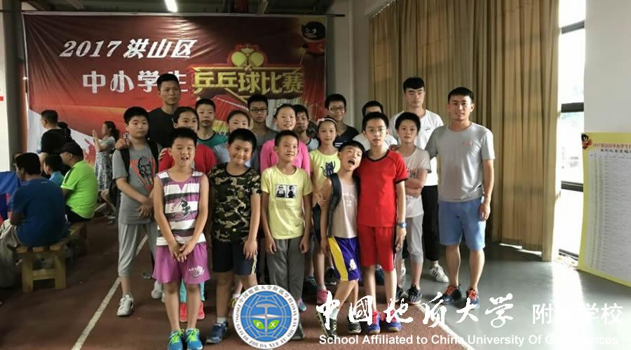 在2017年洪山区中小学乒乓球比赛中,由高飞老师指导的地大附校代表队荣获小学男子甲组团体赛第三名,五(1)班的胡睿诚在小学男子甲组单打比赛中荣获第三名,六(1)班的邵晨希在小学女子甲组单打比赛中荣获第三名。