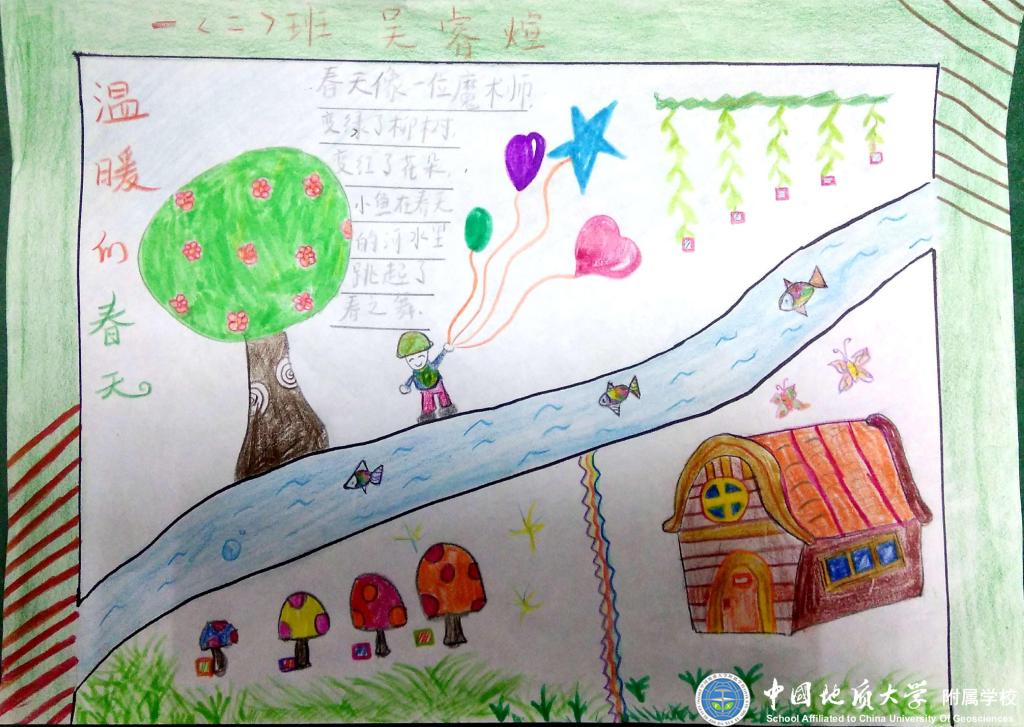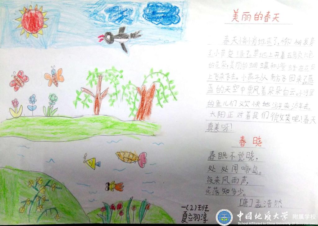 暖暖的春风伴着泥土的芳香唤醒了沉睡的大地,吹跑了小朋友们的大棉袄,吹高了风筝。嫩嫩的小草从大地妈妈的怀抱里探出头来,一朵朵可爱的小花张开笑脸在迎接小燕子的归来,小动物们都出来活动了,大地一片生机勃勃的景象。瞧!一(2)班的孩子们在美丽的大自然里找春天!