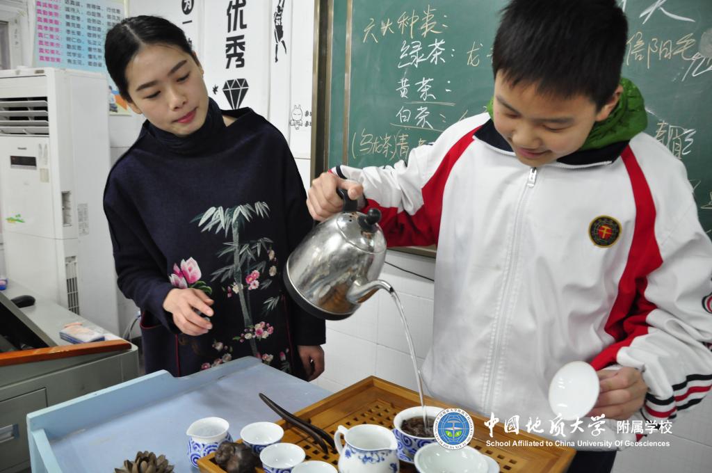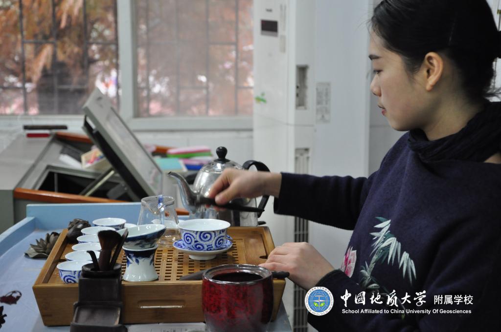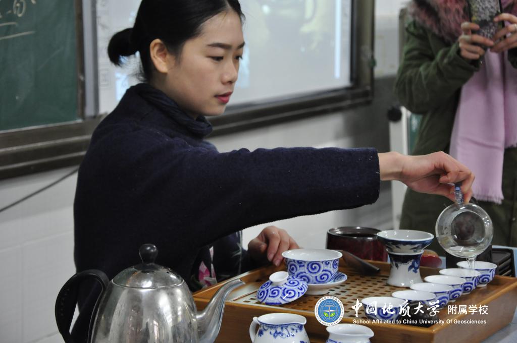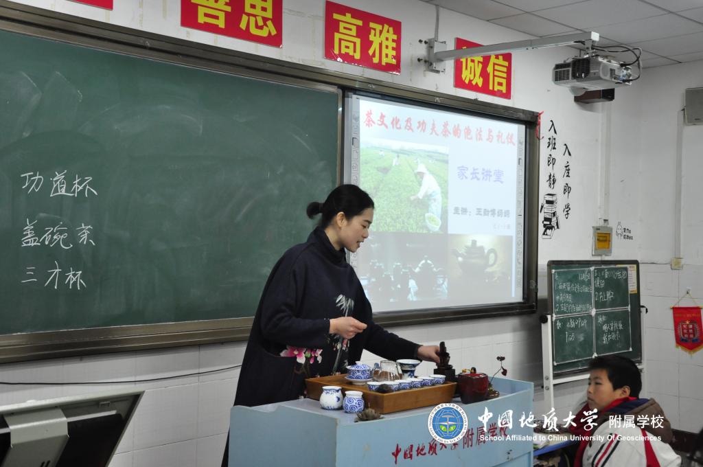 为了使同学们更深入了解中国的传统文化,七(1)班王劲博同学的妈妈和她的朋友们给同学们上了一堂关于茶文化的课。首先,她们向我们介绍了茶叶的类别,接着向我们介绍了茶具,在了解完大概的茶文化之后,老师就开始给我们演示“功夫茶”的泡法。老师给全班同学都倒了一杯茶,让大家品尝。最后,老师叫了几位同学上台亲身体验泡“功夫茶”,这节课圆满结束。