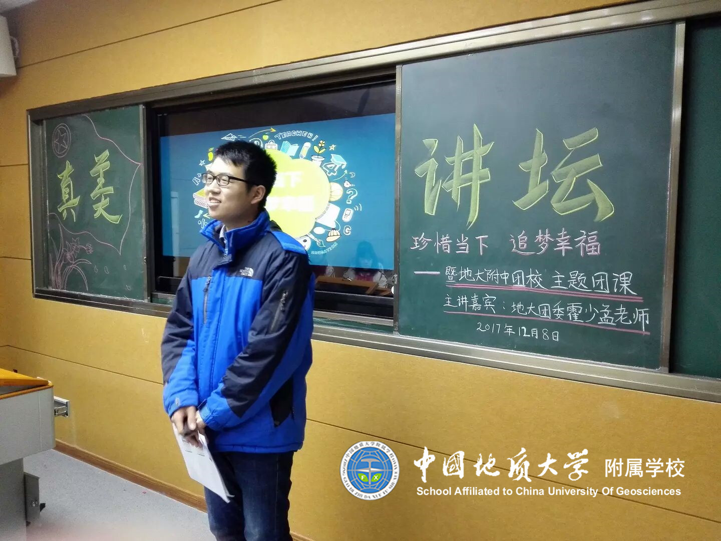 为引导新一代团员树立正确的价值观,为营造诚信、互助、友爱的和谐氛围,12月8日下午16时,附校九年级预备团员在阶梯教室开展了以《珍惜当下,追梦幸福》为主题的团课。