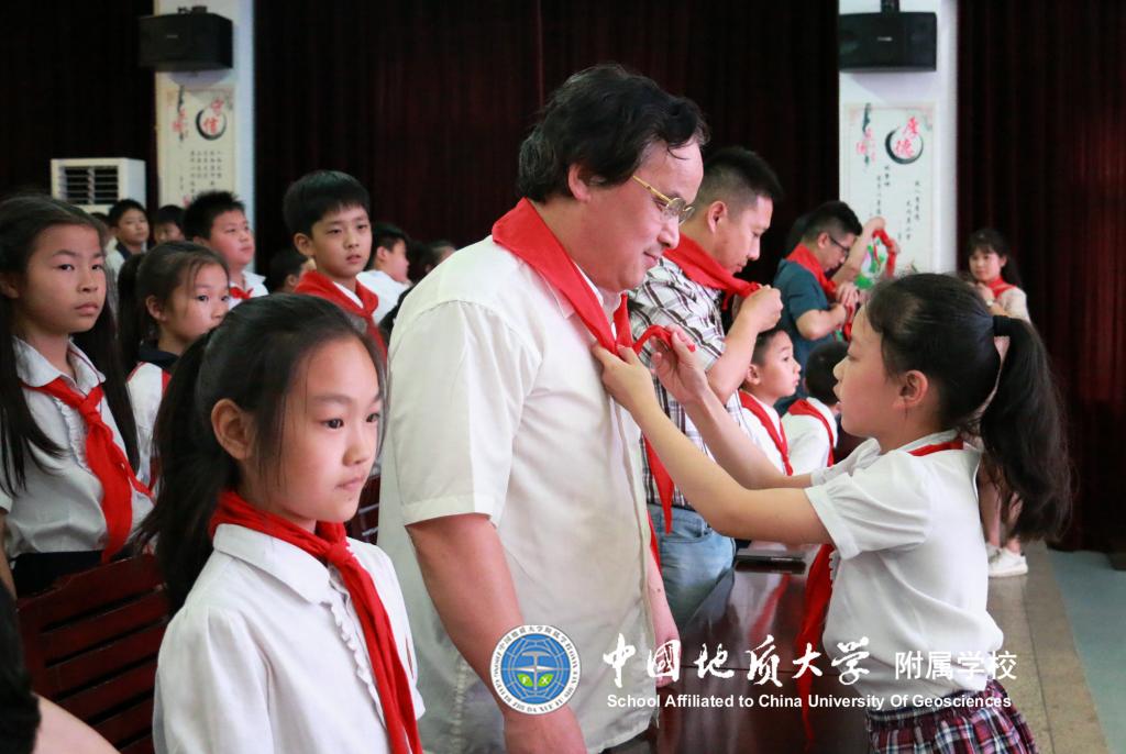 地大附校黎义波校长讲话,他再次对地大图书馆的老师们表示衷心的感谢,肯定了此次活动对队员们的教育作用,勉励大家阅读更多的经典书籍,他还提到我们读书的意义及为什么要读书,鼓励队员们多读书、读好书、好读书。