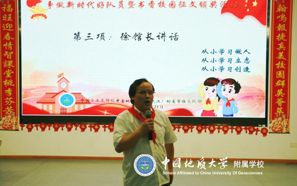 其后,地大图书馆徐馆长致辞,肯定了附校积极参加活动的热情及队员们的优良风貌,最后激励大家多读书、读好书,把经典传承下去。