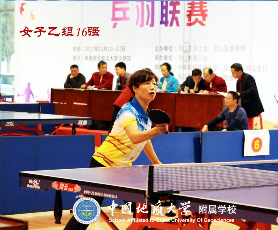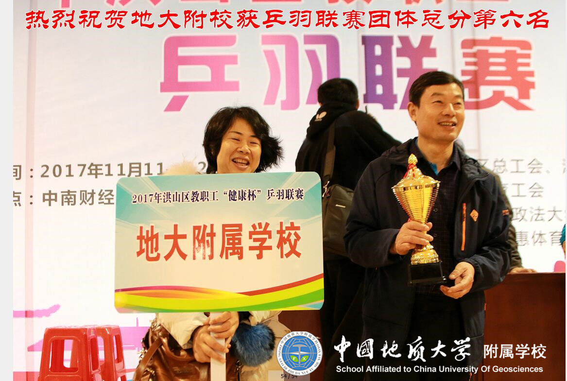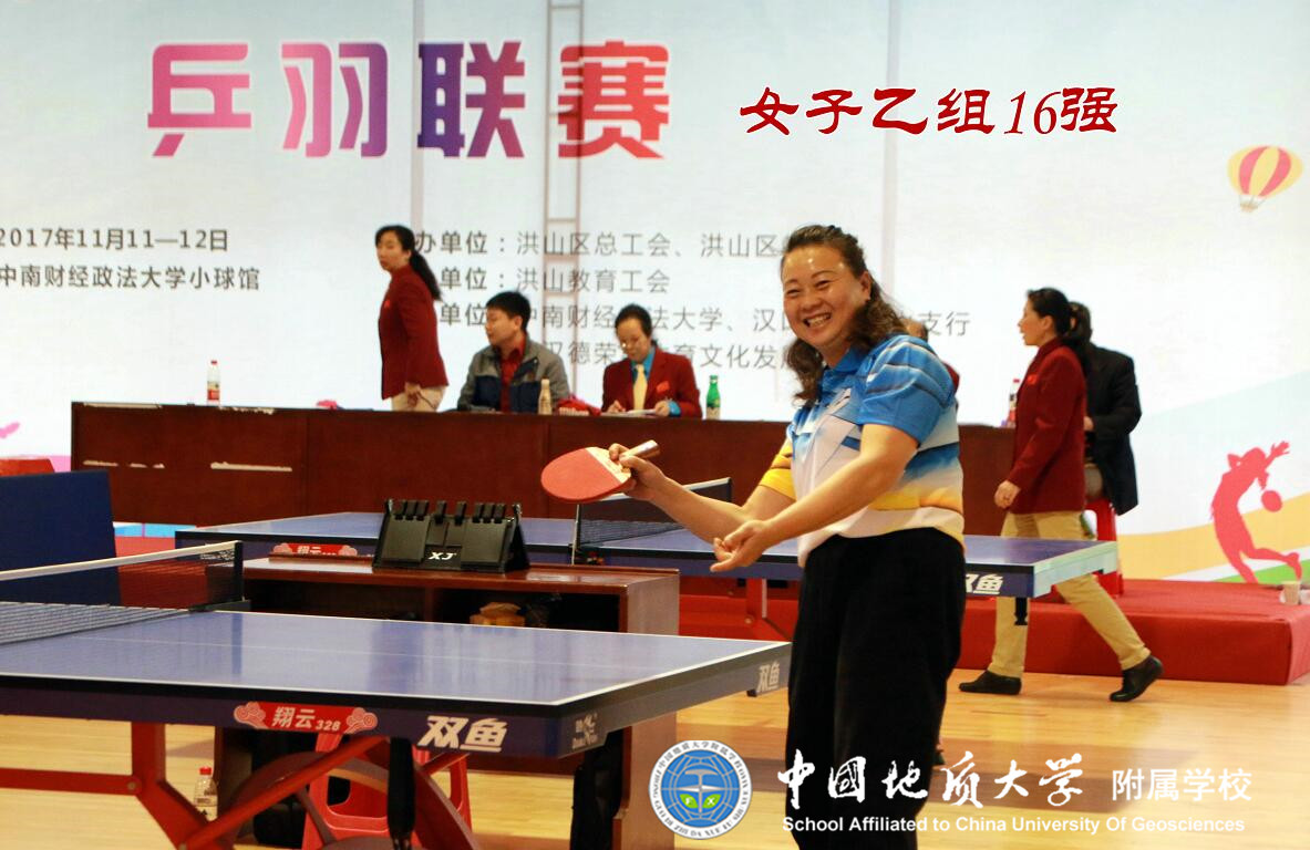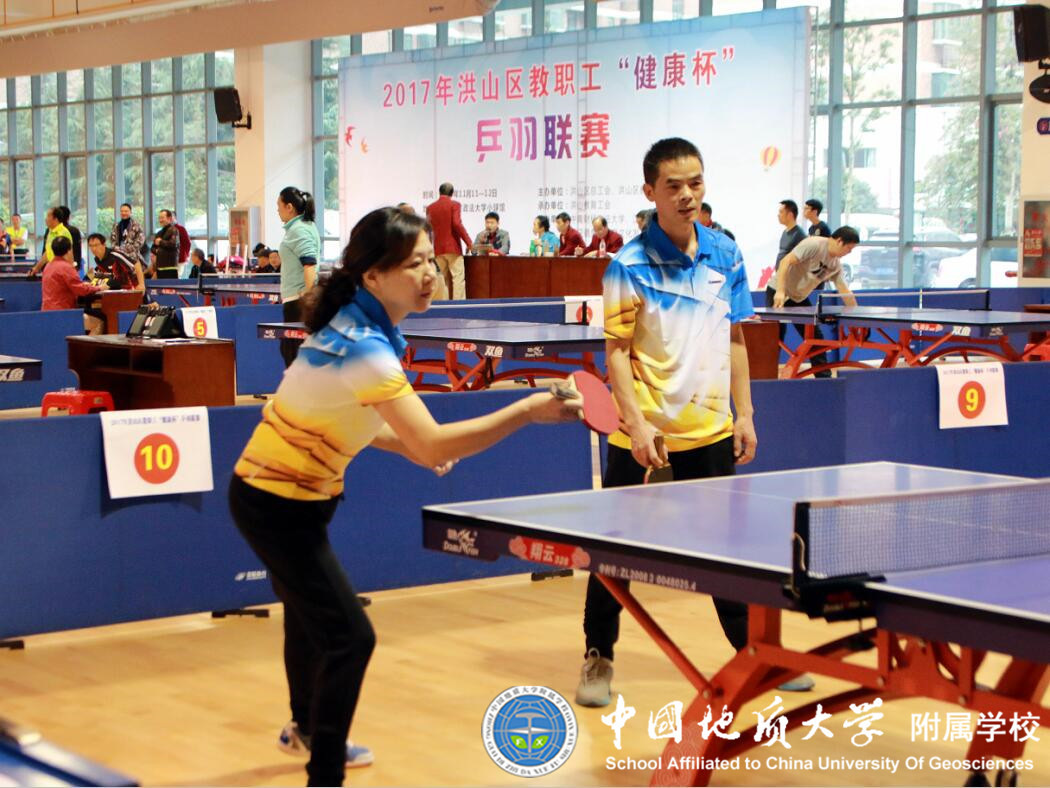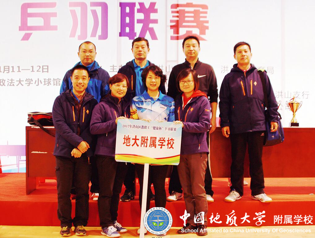 2017年11月11、12日,在中南财经政法大学体育馆,进行了由洪山区总工会、洪山区教育局主办的2017年洪山区教职工“健康杯”乒羽联赛。地大附属学校提前备战,精心组织21名教职工参加了比赛,通过顽强拼搏,荣获团体总分第六名佳绩,展示了地大附属学校教职工风采。