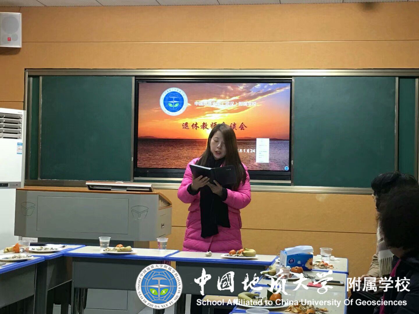 最后陈主席总结发言。她说附属学校退休教师的队伍越来越强大了,这是一支依然充满活力的夕阳红团队。这支团队的成员们曾经坚守在各自的岗位上,有的是:校长、书记、各科老师……为学校的发展建设作出贡献,他们奠定了坚实的基础。学校今天的成绩,离不开每位老师辛苦付出,在座的老师退休后不忘初心,不忘自己是地大附校人,退休后发挥余热,献言献策,为附校再展宏图提出了许多的宝贵的意见,营造了良好的办学氛围。我们将传承附校薪火,不辜负大家的殷切期望,为把附校办成大学、家长、学生、老师、社会满意的学校不懈努力!今天是“腊八节”俗称“腊八”,是汉族人传统节日,是祈求丰收和吉祥的节日。我们回家都吃吃腊八粥,图个好彩头,在这里祝愿我们的学校红红火火,越办越好,祝福老师们身体健康,退休生活更加多姿多彩!提前给老师们拜个早年:吉祥如意,阖家欢乐!最后希望大家今后一如既往,发挥余热,继续为附校发展献计献策。
