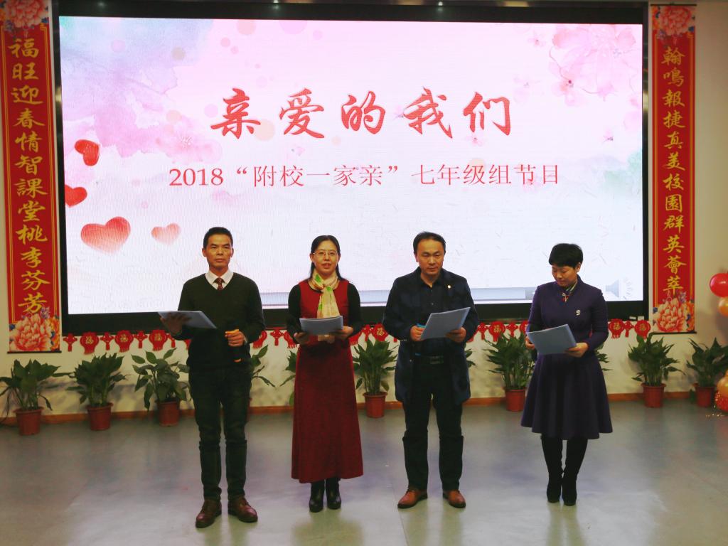 2018年1月30日下午,附属学校科技楼四楼阶梯教室里荡漾着一片欢声笑语。原来是这里正在开展2018年迎新春“附校一家亲”联欢活动,来自中、小、幼三个部门的教职员工140余人欢聚一堂,现场气氛其乐融融,观看节目的还有退休教师代表和家长代表。
