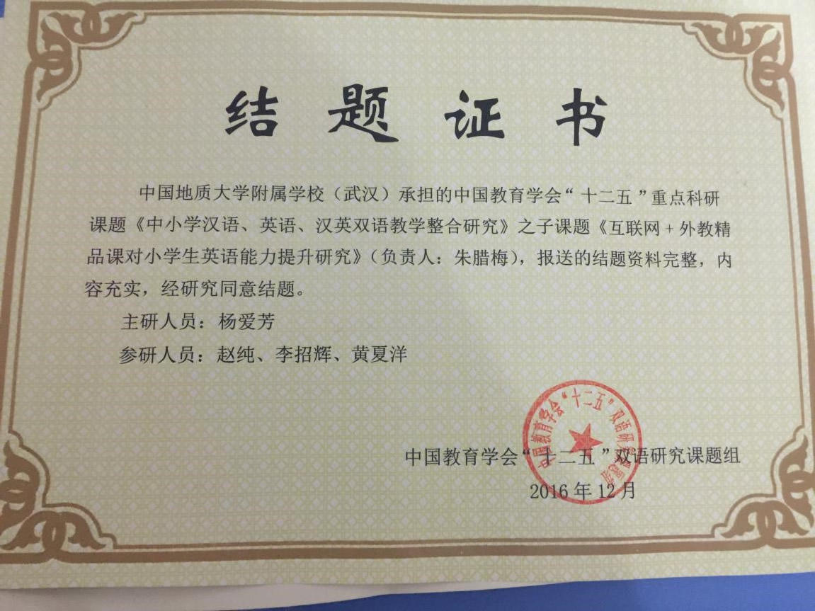 教师工作室承担着对学校科研工作的研究、指导、服务以及对教学科研成果开发、推广工作。因此工作室带头人应努力为教师们开展教科研工作多出点子、多想路子、多搭台子,带动教师积极参与教科研,提升教科研工作能力。2016年,我们根据学校要求,积极参与中国教育学会“十二五”科研重点课题《“汉语,英语,汉英双语”教学整合研究》的子课题《互联网外教在线对小学生英语听说能力提升的综合研究》。由杨爱芳老师牵头,组织工作室成员赵纯老师,李招辉老师和黄夏洋老师开展多层次、多渠道、全方位的研究,我们边实践,边研究,边探索。为了使课题研究早出成果,老师们每月采用集中和分散相结合的方法,全面系统地做好数据资料的收集与整理,使课题研究迅速落到实处。在课题研究的同时,我们根据所承担的课题进行专题学习、交流,使课题研究的目标更加明确。通过我们英语工作室全体成员的努力,2016年底课题顺利结题。我们认为这是工作室走上规范课题研究的一个起点,也是课题走进课堂的一个起点。在这次课题研究中还存在着许多问题,工作室参与课题的能力距学校的要求还有一段差距。但我们相信,有学校领导的关心和指导,我们必将以更多的智慧和心力,务实奋进,开拓进取,扎扎实实开展工作,积极参与各级各项课题研究。